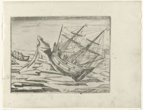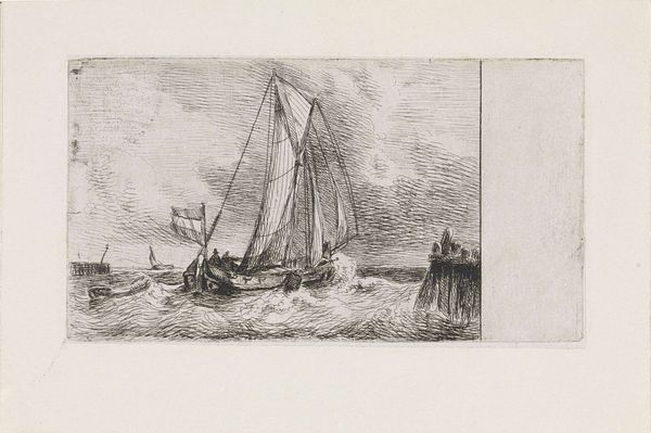 Curator: This is "Zeilschip op zee," or "Sailing Ship at Sea," created in 1863 by Petrus Paulus Schiedges I. It’s rendered with pen and ink on paper. Editor: It feels spontaneous. Almost like a sketch done quickly at the water's edge. There’s a raw, unfinished energy to the linework. Curator: Indeed. Schiedges’s quick lines capture the feeling of being out on the water; the motion of the waves, the weight of the sails... the sea represented by simple pen strokes. There's almost a meditative quality that can emerge in art about boats, journeys, movement. Editor: And that's what I appreciate: the simplicity of the materials emphasizing labor. Pen and ink is available to pretty much anyone. It makes you consider the democratization of artistic creation during this time period. And I wonder how accessible sailing was... and whether Schiedges was portraying something common, or idealized. Curator: An excellent point. Schiedges, a part of his time, captures the spirit of Romanticism in this drawing, evident not just in his use of subject matter but in evoking sublime emotion, the relationship between humans and nature... Sailing at the time symbolized adventure, escape, perhaps longing for the unknown, considering Holland's identity in exploration, maritime achievements and trade throughout the world. Editor: Even in a sketch, you can get a sense of labor through craft, and by that, a wider understanding of Dutch economy during this era. I imagine the work itself as a quick gesture made with limited materials. What a contrast to shipbuilding. Curator: A profound insight into the essence of Schiedges’s piece: beyond its literal depiction, there is always this invitation to consider sailing's profound cultural impact, an act ingrained with a blend of longing, the call of the unknown, and a yearning to conquer. Editor: It makes me see that seemingly simple sketch as the beginning of something far more substantial. Curator: Precisely, seeing a work of art under new light allows for an expanded meaning. Editor: Definitely a view now on "Zeilschip op zee" that I am unlikely to forget!
