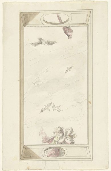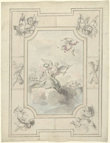 Curator: This watercolor, attributed to Dionys van Nijmegen and created sometime between 1715 and 1798, is titled "Ontwerp voor een plafondschildering met musicerende vrouwen op wolken," or "Design for a Ceiling Painting with Music-Making Women in the Clouds." Editor: My initial reaction is a sense of lightness, airiness. The oval composition and pale washes of color really emphasize the heavenly theme. It's an idealized space, perfectly Rococo in its grace. Curator: Indeed. And the Rococo style, with its emphasis on ornamentation and pastel palettes, often served to legitimize and aestheticize the indulgences of the aristocracy. These female musicians playing their instruments among the clouds become an allegory for leisure and refinement. Consider the social stratification implied; who is privileged enough to inhabit such a blissful, unproductive space? Editor: Absolutely. There is an almost giddy excessiveness here in the delicate rendering of fabric, wings, instruments, clouds, cherubic faces, even the frame enclosing the scene. Note the painterly application of the color; in some areas it is thick with sediment, creating interesting contrast of texture and weight in an otherwise ephemeral medium. Curator: The inclusion of putti, or cherubs, also points to a symbolic language used to signal piety, yet blended with the sensuality so popular in the period. The imagery certainly speaks to broader themes of divine right and the visual representation of power in 18th-century Europe. The presence of musical instruments underscores an allegiance to Apollo and the Muses—patrons of music, poetry, and the arts—implying refined cultivation and good taste on behalf of the patron commissioning the final work. Editor: The loose application of the washes, almost like preparatory underpainting, conveys an unfinished state which offers viewers a fascinating insight into period technique. Look at how the cloud formations act as tonal scaffolding supporting a cluster of feminine figures. The floral basket anchoring the lower center contrasts the airy figures overhead with earthly presence. The design relies heavily on principles of contrast and counterpoint for visual stimulation. Curator: Reflecting on this work through a critical lens offers us insights into the historical context in which beauty was not merely aesthetic but rather functioned as an ideological apparatus, reinforcing class divisions and justifying social hierarchies. Editor: Yes, by examining formal strategies, the role of color, composition, line, and symmetry we can see that even ephemeral visual media like watercolor acted as potent vehicles to uphold structural and thematic unity.