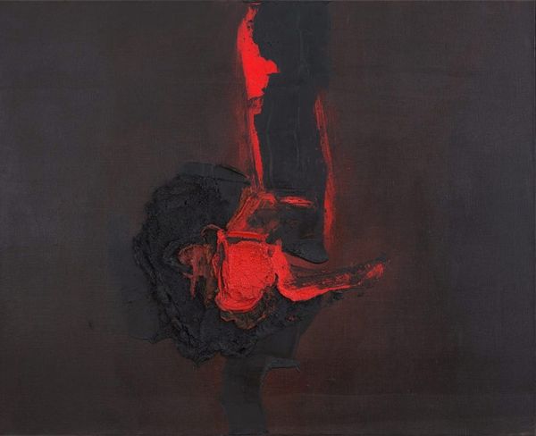 Editor: This is Arnulf Rainer's "Wine Crucifix," its date is unknown, residing in the Tate Collections. The black paint dominating the canvas is striking. What do you make of the materiality in this work? Curator: I see a fascinating tension between the apparent spontaneity of the dripping paint and the deliberate act of layering and obscuring. Consider Rainer's process: how does this act of overpainting change the meaning of the underlying form, and what statement does it make about artistic production? Editor: So, it's less about the religious iconography and more about the act of creation and destruction? Curator: Precisely. It asks us to think about the labor involved, the materials used, and the artist's choices in manipulating those materials. This lens shifts the focus from the purely symbolic to the physical and social aspects of art-making. Editor: I see it now. Thanks for illuminating the materiality, it definitely changed my perspective. Curator: My pleasure. Thinking about the process and materials really enriches the experience.