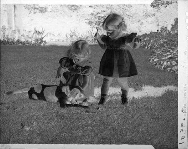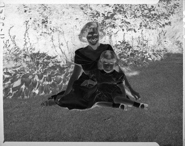 Curator: This is an untitled photograph by Lucian and Mary Brown, housed here at the Harvard Art Museums, measuring roughly 4 by 5 inches. It depicts children playing with a wagon. Editor: It's striking how the inverted tones give it an otherworldly feel, almost like a memory fading. What was the impetus behind their photographic work? Curator: The Browns were active in amateur photography circles. Their work often documented everyday life, reflecting the social values and leisure activities of their community. Editor: It is important to remember the material process. This image is a negative, which speaks to the hands-on practice of photography at that time. The chemical processes, the darkroom labor... Curator: Precisely. And the fact that it’s a family collaboration shifts our understanding of authorship and artistic intent, complicating notions of individual genius. Editor: It makes you consider the value placed on the labor involved in producing a photograph, shifting our perspective from simply the image to the materiality of the process. Curator: Indeed. The image resonates beyond its surface. It speaks to the broader public engagement with photography and its role in shaping social memory. Editor: It's a reminder of the tangible effort behind every image, a physical process often overlooked in our digital age.
