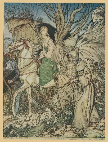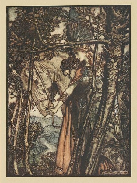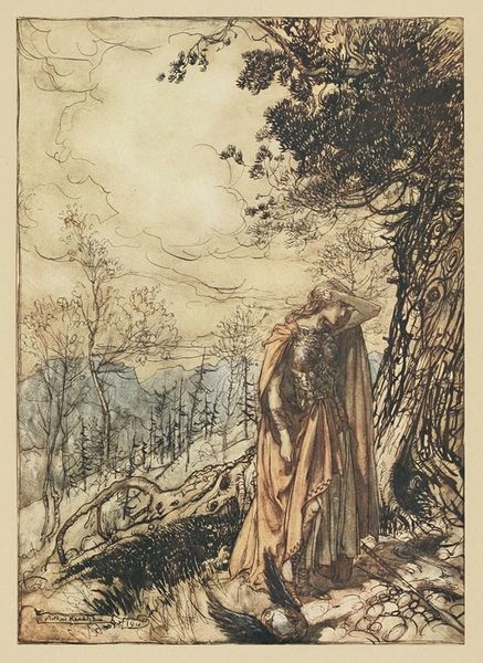 Arthur Rackham made this drawing of Brunnhilde with her horse, at the mouth of the cave, sometime between 1867 and 1939. What I love about his ink and watercolor drawings is the mark making. The lines and subtle colors are all about process. Looking closely, I see how the lines build up the forms, especially in the craggy rocks. See how he uses short, quick strokes to create texture and depth? It’s like he’s mapping the surface, feeling his way through the shapes. I am drawn to the way Rackham uses a limited palette, mostly muted grays and browns, with just a touch of color. It gives the drawing a dreamy, otherworldly quality. It makes me think of other illustrators like Aubrey Beardsley, who also used line in such a powerful way. But where Beardsley is all about elegance and refinement, Rackham is more interested in the raw, untamed beauty of nature. For me, this piece is about embracing the messy, unpredictable process of art making.