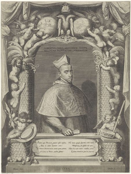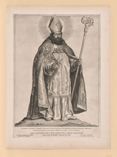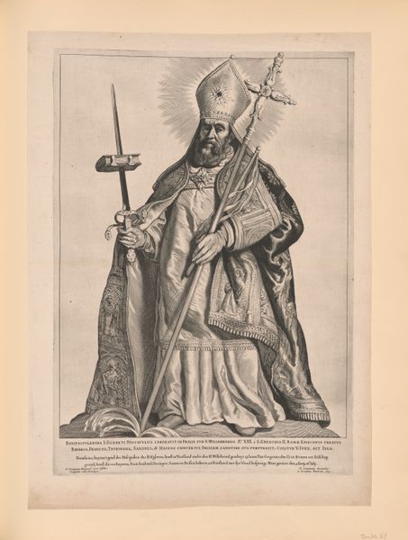 Editor: Here we have a print from between 1800 and 1802, “Portrait of Pope Pius VII”, by Jan Gerritsz. Visser. It's quite detailed. The crosshatching creates a texture behind the figure that makes him pop out. I wonder, what do you notice first when you look at this portrait? Curator: I am immediately drawn to the compositional balance. The figure occupies the central space, with his hand raised in a gesture of benediction, creating a strong vertical axis. This is elegantly counterpointed by the horizontal emphasis of his papal robes, laden with intricate patterns. It’s a study in contrasts between the active and passive, wouldn’t you say? Editor: That’s a good point about the robe. Do you think its detailing is too busy, competing for attention with the Pope’s face? Curator: One must consider that in formal portraiture, detail is not merely ornamentation, but a symbolic language. The complex embroidery speaks to the authority and status of the subject. Observe, too, how the play of light and shadow across the engraving gives form and depth, emphasizing the texture of the clothing. This chiaroscuro is central to understanding the visual impact. Editor: I see what you mean about the symbolic weight now. Looking at the details really adds depth. Thanks for pointing that out! Curator: Precisely. By focusing on formal elements, one gains a deeper understanding of the intended message and its aesthetic realization.