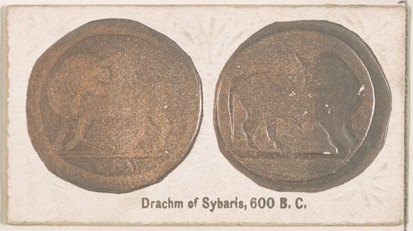 Curator: What a find! Here we have a print from 1888 by Wm. S. Kimball & Co. in their Ancient Coins series. It showcases an Athenian Tetradrachm dating all the way back to 230 B.C. itself! Editor: Whoa, okay, first impression? Ghosts. It looks like faded memories. These ancient coins peering through time. The colors are almost gone and everything feels softened. Curator: Yes, the toning definitely contributes to that feeling of antiquity. What really captures my imagination are the symbolic choices, repeated over centuries. See the owl, the symbol of wisdom, a tribute to Athena, staring out at us? Editor: Totally! It's like a talisman, promising enlightenment, wisdom etched in the very metal that funded ancient Greece! It’s cool to see it reborn on a paper card. Is this a photo of the coin, then? Curator: It is! Think about what it means to reproduce something so deeply linked to culture. Coins carry history, economies, dynasties. By the late 1800's this company chose to circulate and educate about cultural origins with mass media and collectible cards. Editor: Exactly, the symbolism then deepens. Kimball & Co. picked up this echo to lend sophistication to... tobacco products, right? A 19th-century remix using classical iconography for modern-day pleasure. The owl became the silent endorser of indulgence. It's beautifully ironic! Curator: I agree. The symbolism layered on symbolism makes you think. And each version changes slightly based on needs, audience, and culture, yet manages to echo still across vast stretches of time. What a journey. Editor: Totally a portal, both to ancient Athens and to Victorian marketing, where everyone from philosophers to flappers could find something gleaming! Makes you think about what coins of the future might hold as symbols, and who decides what to show.