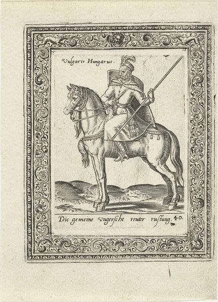 Curator: Abraham de Bruyn created this engraving, "Arabische edelman en zijn vrouw te paard," or "Arab Nobleman and his Wife on Horseback" around 1577. It resides here at the Rijksmuseum. The figures, presented within a very ornate frame, strike me as exceptionally still. Editor: The stark, graphic nature immediately makes me think of the power dynamics at play. The nobleman is placed forward, a symbol of status and dominance, yet the image is rife with the orientalist imaginings of the time. Curator: Indeed. De Bruyn, working in the late Renaissance, was likely less interested in factual representation and more engaged in constructing a visual statement about cultural difference. Consider the attire: The tall headdress on the man, her full covering, meant to signify otherness to European audiences. It perpetuates stereotypes. Editor: Absolutely, and consider the weight of horses as symbols of conquest, trade, and social stratification throughout history. The woman riding behind speaks volumes; where does she fit within the social discourse of the artwork and the represented culture? It almost acts as propaganda through subtly presented symbols. Curator: The artist uses the established symbolic language of portraiture and courtly display to depict people from another culture. There is no engagement with Arab subjectivity. The use of “Arabische” as a descriptor lumps a very diverse region into a monolith for European consumption. Editor: Note the almost illustrative quality, resembling depictions in illuminated manuscripts or early printed books. De Bruyn translates real-world observations through established visual rhetoric, reinforcing preconceived ideas about gender roles and cultural identity through clothing, posture and relative placement. This work operates within, and strengthens, the structures of early modern Europe. Curator: The framing devices further emphasize its status as an exotic specimen observed, and contained, for European viewers. We see the depicted figures mediated, classified, and controlled through representation. Editor: The enduring power of images. It prompts us to consider what purpose these early prints had and continue to have and what narrative functions they serve within collective memory. Curator: Thinking about how images historically portray power is vital. The act of observing carefully always leaves us more critical than when we start. Editor: A potent reminder that these early portrayals built narratives that, sadly, persist even now, in a globalized setting.