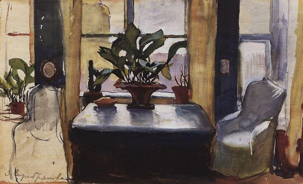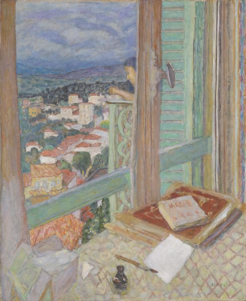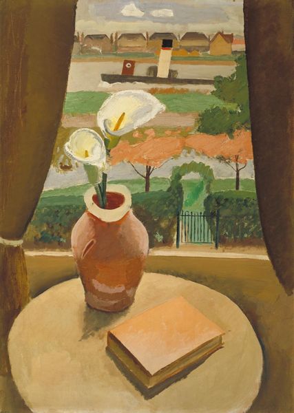Editor: This is Vanessa Bell's "Interior with a Table," from the Tate Collection. The sunlight flooding in makes me think of lazy afternoons. What do you see in this piece? Curator: It whispers of quiet domesticity, doesn’t it? Bell captures a sort of painterly hush. The way she flattens the perspective, almost like a stage set, pulls me in. Do you notice how the interior space and the landscape beyond seem to merge? Editor: Yes, it’s like the outside is invited in. It feels very intimate. Curator: Exactly! It’s a very personal glimpse into her world, rendered with such gentle strokes. It’s like a visual poem. Editor: I never thought of it that way. Thanks! Curator: My pleasure. It’s all about seeing with new eyes, isn’t it?