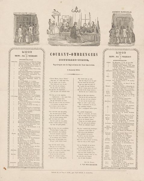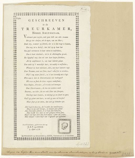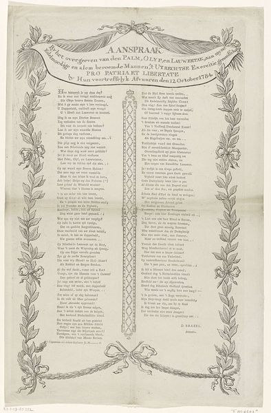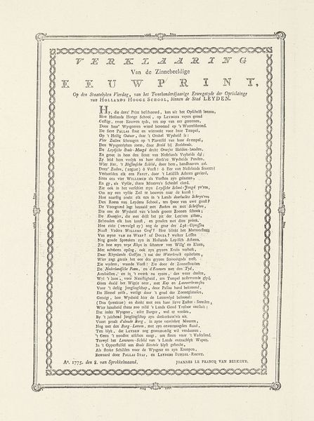 This broadside, printed by J.F. de Ridder & Comp., presents a textual explanation "of birth and marriage." The text is bordered by decorative vines, symbols of growth, abundance, and connection, reflecting themes of fertility, love, and the intertwining of lives in marriage. These verdant motifs evoke ancient associations. The intertwining vines remind us of the classical world’s Bacchus, god of wine and fertility, or the sacred groves of ancient temples, where nature symbolized divine presence. Consider how the symbolism of growth and connection transcends cultures. The continuous, cyclical nature of the vine, which represents life’s journey, reappears across eras. This circular, non-linear trajectory underscores how symbols evolve, adapt, and find new relevance across time, reflecting our collective psyche. The enduring emotional power of these images continues to engage us on a deep, subconscious level, reminding us of the enduring human experiences of love, life, and connection across the ages.