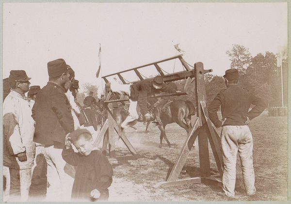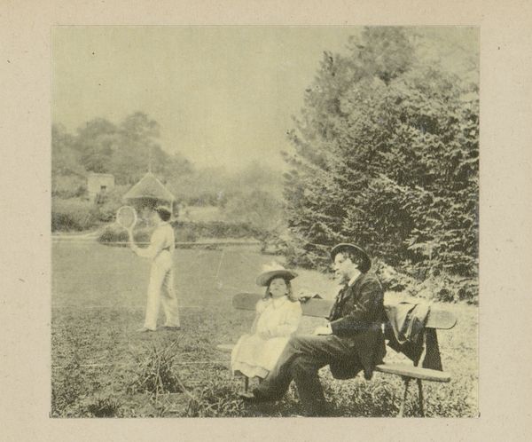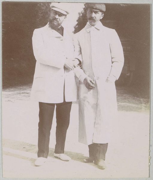 Editor: So, here we have this old photograph called "Fietser en wandelaar schudden elkaar de hand op een weg bij Pontoise," taken around 1897. It's at the Rijksmuseum. I’m immediately struck by how formal the greeting is! A handshake and a doffed hat… What's your read on this scene? Curator: Ah, yes! It whispers of a bygone era, doesn’t it? I see more than just formality, though. To me, it feels almost… theatrical. The backdrop is this almost dreamlike landscape of filtered sepia tones that set an unyielding natural boundary to the encounter. What do you think the landscape tells us? Do you see constraints that inform the exchange? Editor: The constraints remind me of a stage almost, but a public one. They are clearly aware of some social script here. Is it that awareness of script why there's something very poignant, almost humorous, in how seriously they're taking this chance meeting. I suppose nowadays a head nod is more likely. Curator: Precisely! It’s the tension between the intimate gesture – a handshake, an acknowledgement of presence – and the vast, indifferent world around them. This isn’t just realism; it’s realism filtered through a lens of, perhaps, gentle irony. Think about it – photography was still relatively new. There's a self-consciousness about documenting everyday life, isn’t there? They are aware of being perceived. It's charming! It makes me think of silent film and early comedies with their awkward social interactions and hyper formality. Don't you think? Editor: Yeah, like a very still, very quiet, scene from an old movie! I hadn't thought of it like that at all. This piece definitely gives a look into the rituals and constraints, yet also humour and beauty in chance encounter! Curator: It makes you appreciate the small human moments, even those captured through the old, quirky lenses of yesteryear! Art constantly holds up the mirror for us to smile at ourselves in!