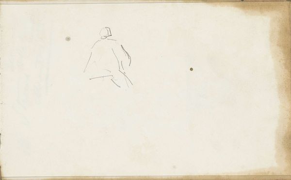 Curator: Looking at Gerrit Postma’s "Man met kap en baard," or "Man with hood and beard," I find myself pondering the potent symbolism woven within its sparse lines. Editor: My first impression is one of starkness. So much empty space around such a diminutive sketch on paper. You really get a sense of the raw materiality and, dare I say, the potential disposability of it. Curator: Indeed. While understated in its rendering using pencil and possibly watercolor, the subject's attire, the hood itself, carries profound implications. Think of its historical weight, associated with monks, scholars, even executioners. Each conjures different meanings. Editor: It is a rapidly sketched and economic portrait. This lends it a specific feeling of utility. Was it perhaps a preliminary study for a larger work, maybe an illustration destined for a print or publication, and if so, for what kind of public? The social life of drawings often goes unseen, doesn't it? Curator: Precisely. The ambiguity allows for diverse interpretations. We don’t know the sitter, the purpose of the sketch, or how Postma intended for it to be viewed. Is he meant to be pitied, respected, feared? The beard adds an element of wisdom or perhaps austerity. Editor: And note the minimal strokes used to describe fabric! I find that captivating. The material presence is undeniably asserted by these sparse and efficient means, and suggests a real focus on economy. There’s almost a democratic ethos embedded in the work’s production, its very making, if you like. Curator: I agree. These unadorned details are not arbitrary. Postma is asking us to reflect on what these archetypes meant in his cultural milieu, what burdens and expectations they carried. What resonances do they hold for us today? Editor: Considering all that has been said, my sense now is of a study in restraint. Postma really is challenging us to observe the tension between form and void, to see potential within limitation.