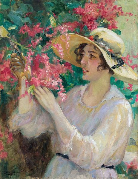 Ipolit Strâmbu captured this scene, Reading in the Garden, with oil on cardboard, and it presents us with a figure of quiet contemplation amidst nature's embrace. The woman’s hat, adorned with flowers, is not merely decoration; it speaks to the age-old association of Flora, the Roman goddess of flowers and springtime, with femininity and renewal. Consider Botticelli's "Primavera," where Flora scatters blossoms, symbolizing fertility. Here, the flowers atop the hat, though modest, evoke a similar connection to nature’s regenerative powers. Her gaze is focused downward, and the book in her hands is a portal to other worlds. The act of reading is a potent symbol, reminiscent of images of the Virgin Mary reading, signifying wisdom and introspection. The garden itself, with its verdant hues, suggests a space of retreat, a locus amoenus, inviting escape from worldly concerns into a realm of serenity. This imagery is cyclical, resurfacing across cultures, transforming and adapting, yet consistently reminding us of our deep-seated longing for tranquility and our connection to the natural world.