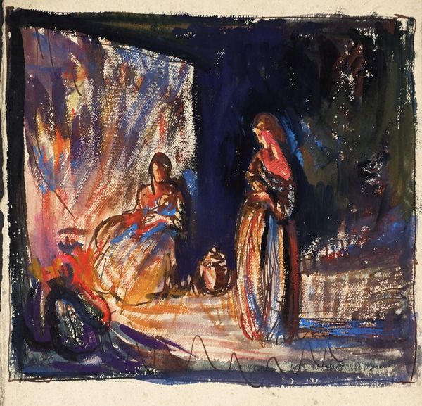 Editor: This is Mitchell Siporin’s "Soldier and Camp Follower," a painting of indeterminate date housed at the Harvard Art Museums. I’m struck by the direct gaze of the figures; it feels very raw and human. What historical context can you provide? Curator: Given Siporin’s engagement with social realism, consider the painting's potential commentary on the socio-political roles within conflict. Who holds power? What societal narratives are being reinforced, or challenged? Editor: It makes me think about the individual stories lost within grand narratives of war. The faces are so individualized. Curator: Exactly. Think about the public role of art during times of conflict. What is Siporin trying to communicate about the individual versus the collective experience? Are we meant to sympathize, critique, or simply observe? Editor: That gives me a lot to think about regarding the painting’s message and impact. Thank you. Curator: My pleasure. It's a good reminder of art's ability to be both a reflection and a critique of society.