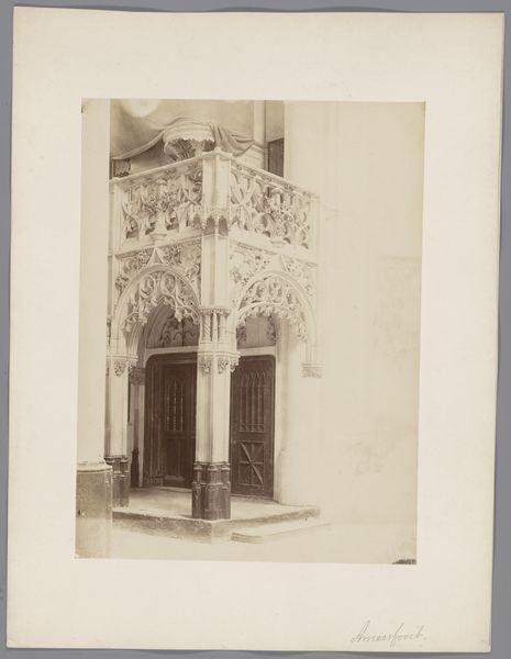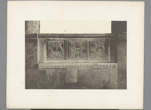 Editor: Here we have a photograph, taken sometime between 1875 and 1900, of part of the choir screen at St. Bavo Church in Haarlem, by Johannes Gerardus Kramer. What strikes me most is the contrast between the intricate carving of the wood and its functional purpose as a barrier. What do you see in this piece? Curator: The photographic print captures more than just an architectural element; it reveals a specific moment in the late 19th century when industry met craft. Consider the production of this screen. It would have required skilled laborers, access to specific materials – the wood itself – and a complex social framework that valued both religious spaces and the ornamentation within them. How do these factors contribute to the object’s inherent meaning? Editor: So, it's less about the artistic intent, and more about the means and context of its creation? I hadn’t thought about it like that. Curator: Precisely. Think about the labor that went into carving that screen versus the relatively new industrial process of photography used to document it. The image becomes a document of its time, illustrating evolving production methods and class structures embedded in art production. Is this just a record, or does it perpetuate existing hierarchies through its medium and circulation? Editor: That’s fascinating. I suppose the choice of photography as a medium reinforces a certain perspective or agenda. It allows for mass dissemination of this carefully crafted, yet stationary, artwork. Curator: Indeed. The photograph flattens the object, democratizing it in a way the physical screen never could be. This in turn makes me consider the ethics of how we interact with art objects through photographs. Editor: I see what you mean. Thanks for providing that insight into the materials and cultural forces at work. I never considered the interplay between craft and industry in such detail. Curator: My pleasure. Considering material conditions expands our understanding of an art object.