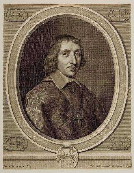 Curator: This is Robert Nanteuil's portrait of Gilles Ménage, created in 1652. The fine lines of the engraving are immediately striking. Editor: The labor involved in those meticulous hatchings and the cross-hatchings! It's a testament to Nanteuil's skill as a printmaker and to the value placed on detailed craftsmanship at the time. Curator: Indeed. The composition is meticulously balanced. Note the contrasting textures—the smoothness of the face versus the patterned fabric of the coat. The book serves as a symbolic attribute of Ménage’s intellectual pursuits. Editor: I wonder about the paper and ink used. Were these materials locally sourced, or part of a larger trade network? It speaks volumes about the economics of art production in 17th-century France. Curator: Ultimately, Nanteuil masterfully captures Ménage's scholarly essence through subtle visual cues. Editor: It’s more than just an image, though. It's a record of the tools, the labour, and the social context that birthed this piece.