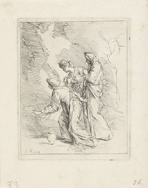 Curator: Jean Jacques Lagrenée’s ink and etching print, titled “The Three Virtues of Theology,” presents a vision that feels almost celestial in its rendering. Editor: Yes, celestial and austere. The etching, with its reliance on line and light, gives the scene an ethereal, almost ghostly quality. It definitely has an emotional impact. Curator: Looking at the three figures, you can read it allegorically, of course, but they seem very psychologically interesting to me. To the left, a woman consoles a vulnerable, reclining figure. Meanwhile, a veiled figure offers a chalice or Eucharist, suggesting grace or acceptance. It seems like the artist explores concepts of compassion and divine mercy here. Editor: That's an interesting read, seeing the central figure as needing compassion. Considering it was likely produced within a heavily religious social framework, it's not hard to believe this was crafted for instruction—visually communicating religious doctrine about theological virtues. Curator: And that’s where the power lies: taking abstract notions and shaping them into visual form. The veiled figure especially resonates. In psychological terms, veils often represent concealment, mystery, and the unknown. Perhaps she represents divine unknowability, the part of faith that must be accepted without proof. Editor: Or it could simply represent tradition and religious institutions' roles in shaping these theological ideas. Either way, the artist participates in and reflects the values of their cultural environment, so it serves as an artifact from the period. The classical references also contribute to this image’s position. Curator: I find the bottom section, the decorative part below, quite intriguing as well; its decorative elements do create some sort of feeling in conjunction with the rest. Editor: Well, for me, these motifs suggest more secular patronage or the tastes of collectors. They speak to the complex interactions between art and social position during the period. Curator: Looking at the image this way, its appeal shifts once more to being both a devotional tool and a status object. Thanks to your insights, my perspective of this artwork has been challenged to deepen once more. Editor: Likewise. It’s precisely those frictions—devotion versus decoration, mystery versus dogma—that keeps us coming back to artworks such as these.