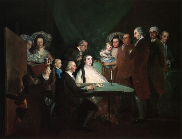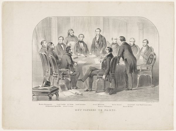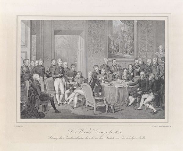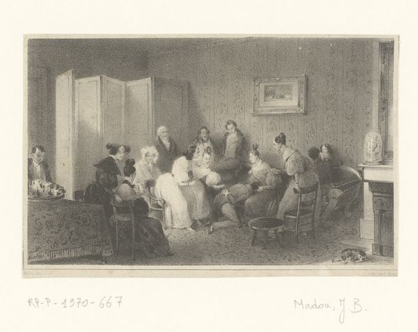 Editor: This is "Samuel Rogers at his Breakfast Table," an engraving by Charles Mottram after John Doyle. It feels like a gathering of important figures. What symbols stand out to you in this image? Curator: The table, laden with breakfast, becomes a symbol of shared ritual and intimacy, doesn't it? Notice how the men are arranged, some engaged in conversation, others contemplating the art on the walls. Each portrait adds another layer to the narrative, suggesting lineage, influence, and the weight of cultural memory. Editor: So the art *in* the art becomes part of the story? Curator: Precisely! These aren't just decorations; they are symbolic stand-ins for their own histories, contributing to Samuel Rogers’ identity. What do you make of the men examining the art to the right? Editor: It emphasizes the importance of art within their social circle. I see how each detail contributes to the overall meaning. Curator: And the way Doyle arranges them, capturing not just likenesses but also something of their inner lives. Food for thought, indeed. Editor: This has given me a completely new way to look at it. Thanks!