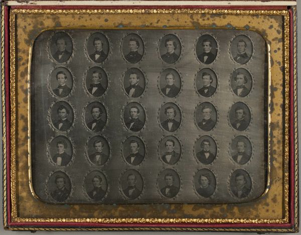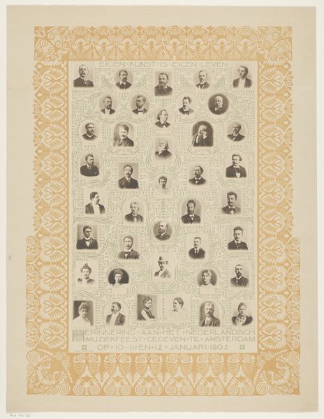 This is "Het servetje: herinnering aan "Oefening Kweekt Kennis"" by Gerard Keller. The artwork presents a grid of portraits, a visual record that speaks volumes about identity and belonging in the late 19th century. Consider the exclusive nature of such a gathering during this period. The subjects, all men, likely represent the professional and social elite of their time. How did gender and class shape access to such networks, and what impact did this have on broader society? The faces immortalized here remind us of the power dynamics at play, where representation and recognition were not universally accessible. What stories remain untold in their absence? This piece invites reflection on the historical forces that determined who was seen and who was excluded, and the ongoing work of reshaping those narratives.