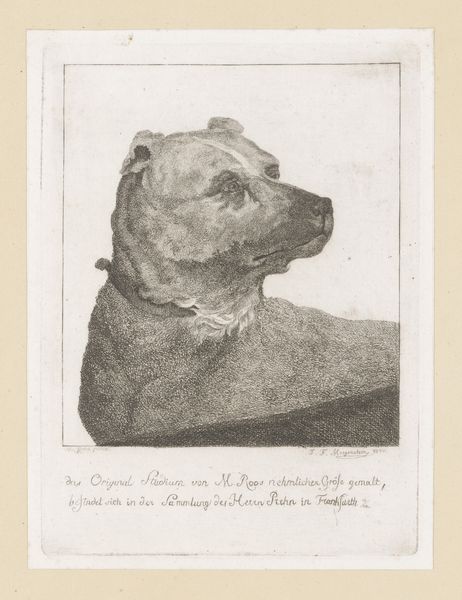 Editor: Here we have Joseph Schippers’ "Head of a Dog with Collar", a pencil drawing from 1894. It's a very simple, almost clinical depiction. I'm curious – what strikes you about the visual structure and composition here? Curator: Immediately, the tight, controlled rendering arrests my attention. Note how the artist meticulously modulates the pencil strokes to sculpt the form of the dog's head. There is a strong sense of geometric order, especially in the juxtaposition of light and shadow. Editor: Yes, the chiaroscuro is really effective. The collar especially; you can almost feel its texture. Curator: Indeed. But it is not simply representational. Observe how the stark lines of the collar serve as a compositional anchor, grounding the subject within the pictorial space. Editor: It's almost as though the dog is a stand-in for another subject. Is there anything further you read into its construction? Curator: Consider the implications of the dog's gaze – averted, perhaps melancholic. This directional vector sets up a powerful visual tension, heightened by the overall tonal restraint. Further, it implicates us, the viewers, who stand in as that to which the animal gazes. This act, combined with its square form in the work, makes the piece a study. The drawing contains its own purpose in the visuality of it all. What did you take from your viewing? Editor: I hadn't thought about the implied relationship with the viewer. Seeing it as a compositional study adds another layer entirely! Thanks! Curator: Quite welcome. It's through close scrutiny that such nuanced meanings are revealed. The visual language is there; we simply need to learn how to read it.