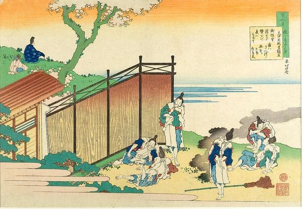 Curator: Hokusai's woodblock print, "The Coast of Noboto" showcases a tranquil scene, doesn’t it? The formal elements—the linear perspective, the blocks of color—create a very harmonious composition. Editor: I see it more as a visual poem about labor, gender, and landscape. These figures navigating the shallows, perhaps gathering seaweed, suggest a story of resilience and survival in coastal communities. Curator: Observe how the torii gates frame Mount Fuji in the distance, drawing the eye through distinct planes. The composition emphasizes the structural interplay between the architecture and nature. Editor: Yet, these gates also carry socio-political weight, marking boundaries, both physical and spiritual. How do they regulate movement and access for the people depicted within the frame? Curator: Well, the application of color is equally deliberate. The varying blues in the sky and water, the greens of the landscape, contribute to an overall sense of serenity. Editor: And that serenity masks the everyday realities of those whose livelihoods depended on the sea. It’s crucial to consider power dynamics in this seemingly idyllic landscape. Curator: Ultimately, Hokusai masterfully employs formal elements to capture a fleeting moment. The Coast of Noboto is a testament to his artistic brilliance. Editor: Indeed, a closer look reveals layers of meaning beyond the purely aesthetic, inviting us to engage with the human stories interwoven within.