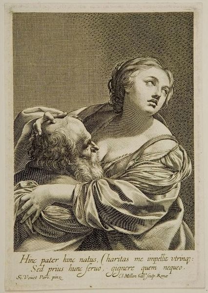 This engraving, "Roman Charity," was created by Claude Mellan in Rome, likely in the 1620s. It depicts a scene drawn from ancient Roman history, of a daughter, Pero, secretly breastfeeding her imprisoned father, Cimon, who has been condemned to death by starvation. The image creates meaning through a complex interplay of classical reference and Christian virtue. Mellan was French, but trained in Rome; the city was then at the heart of the Catholic world, and the visual language of its artists was steeped in Counter-Reformation ideals. By depicting the intimate act of a daughter saving her father's life, the image speaks to the virtues of familial piety and self-sacrifice, highly valued by the Church at the time. Yet, the image also critiques rigid social structures, suggesting that compassion and human connection can transcend institutional injustice. To fully understand the significance of "Roman Charity," art historians consult a range of sources: classical texts, religious treatises, and biographies of artists. By situating the work within its historical context, we can begin to understand the complex social and institutional forces that shaped its creation and reception.