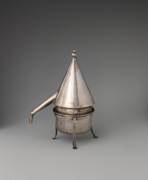 Curator: Look at this stunning "Miniature kettle with cover and brazier," crafted between 1713 and 1714. It resides here at the Metropolitan Museum of Art. Editor: My immediate impression is one of intricate elegance. The scale seems diminutive, demanding a closer inspection to fully appreciate its features, like some architectural feat shrunk to table size. Curator: Absolutely. Made of silver, its existence speaks volumes about ritual and luxury of its era, particularly Baroque era. Think about the stories and social practices contained within an object such as this. Silver, itself, carries a symbolic weight. Editor: The materiality, the reflective surfaces… It's interesting how the artisan utilizes the innate characteristics of silver to not only reflect light but also establish a formal structure with curves, edges, and angles, lending it the essence of Baroque aesthetics. The decorative treatment almost seems a functional necessity, strengthening the overall effect. Curator: The kettle as a container speaks of societal tradition, of domesticity, certainly, but perhaps of trade routes and far flung corners of the world providing tea or coffee. Editor: Observe the interplay between the solid and the void—the vessel contrasting with the openwork brazier. This careful juxtaposition establishes a visual rhythm that enhances the object's elegance and its perceived preciousness. There is an almost fractal relationship. Curator: Consider what this kettle implies about trade between cultures and classes. It embodies an alchemy of materials, culture, and class distinction, hinting towards trade across various regions. Editor: Looking at its pure form I detect more than simple design and use; instead I appreciate a crafted expression speaking of functional elegance and cultural value using pure material. Curator: It is beautiful, but seeing it does invite the possibility to decode narratives, cultural contexts and human connections spanning time. It's so very complex in that respect. Editor: Seeing this, it is impossible to imagine this level of design ever being replicated by any machine, but instead could have only been achieved through human craft.