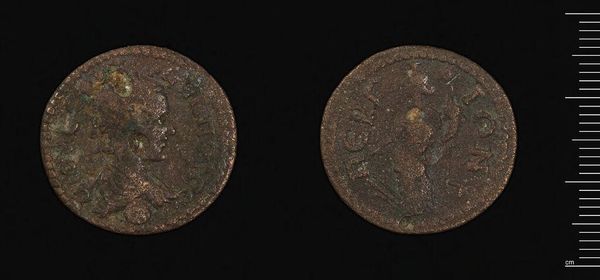 Curator: This is a coin of Perge under Gallienus, currently held in the Harvard Art Museums. Editor: What strikes me immediately is its weathered surface, a testament to its age and history. Curator: Indeed. The material degradation offers a window into the coin's journey through time, hinting at the conditions it has endured and how socio-political forces shape its reception as an artifact. Editor: From a purely formal perspective, the worn textures create an intriguing interplay of light and shadow, obscuring the original design yet revealing something new in its fragmented composition. The circular form contains the portrait and the reverse which seem to offer a formal balance. Curator: It speaks volumes about Perge's local economy and its connection to the broader Roman Empire under Gallienus. Coins acted as propaganda, circulating imperial power and influence. Editor: Fascinating how its physicality bears witness to both artistic intention and the ravages of time. Curator: Quite so, it is like a tangible record of shifting societal tides.