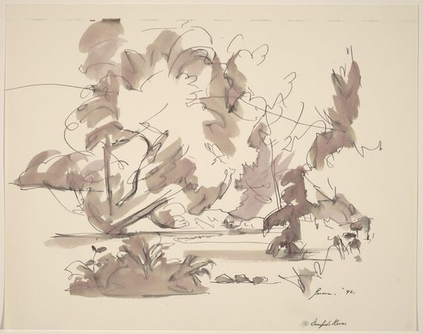 Ramon Gabriel made this watercolor landscape on paper sometime in the mid-20th century, and what strikes me is how the scene is constructed, almost like a collage of watery shapes. The way the paint bleeds and pools, especially in that blue-green mass on the right, it’s like Gabriel is letting the water do its thing, allowing chance to play a role in the image-making. I find my eye lingering on the lower part of that blue-green patch, where darker strokes hint at hidden depths, suggesting more than they reveal. It's the most resolved area of the painting. This embrace of process and openness reminds me a bit of John Marin, another watercolorist who wasn't afraid to let the medium speak for itself. Like Gabriel, he captured something beyond the purely representational, hinting at an inner vision. Ultimately, what I find so compelling about Gabriel’s landscape is its willingness to embrace ambiguity.
