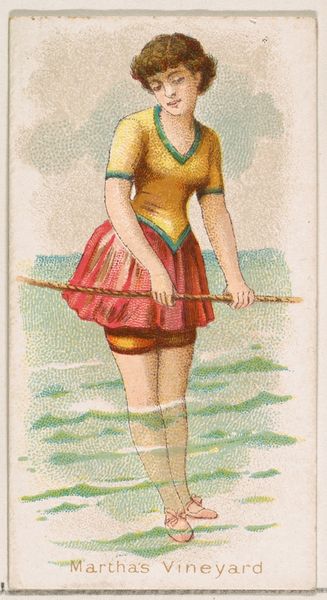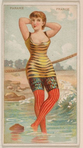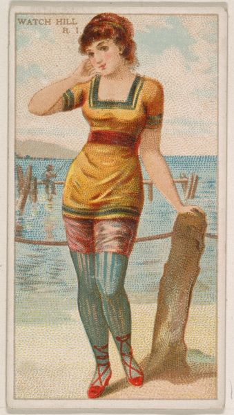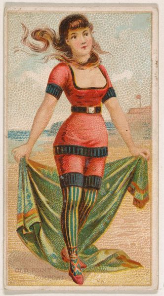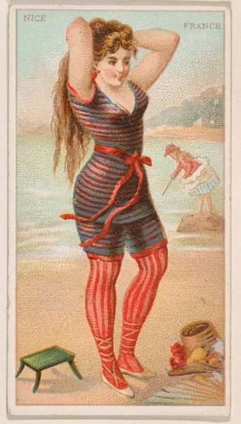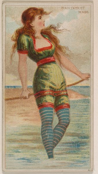 This chromolithograph was made by Kinney Brothers Tobacco Company as a trade card. It comes from a series called "Surf Beauties." Trade cards like this one gained popularity in the late 19th century. They were cheap to produce and acted as advertisements, slipped into product packaging like cigarette boxes. Here, we see how the image of a fashionable woman is being used to sell tobacco products. The "Surf Beauties" series romanticized leisure and outdoor activities, connecting these aspirations to the consumption of tobacco. The card also speaks to changing social norms regarding women's roles and visibility in public spaces. While modest by today's standards, her bathing costume was quite daring for the time! This image participates in the shift toward more liberated representations of women in advertising, yet it also reinforces the objectification of women by associating them with consumer goods. Understanding images like this requires archival research into the history of advertising, the tobacco industry, and the changing status of women in society.