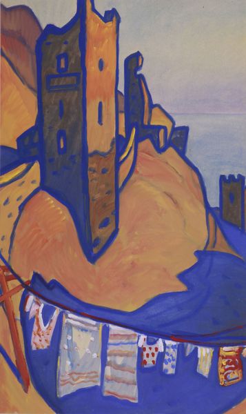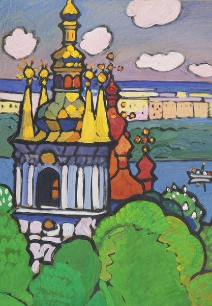 Curator: Standing before us is Yuriy Khymych's "Golden Gate (architectural motif)," created in 1960 using tempera. A rather striking piece. Editor: It feels intensely somber, almost like looking at a forgotten memory. The cool blues juxtaposed with the fiery oranges are arresting. There's a strange comfort in it though, like a fairy tale city emerging from the shadows. Curator: Absolutely. Khymych’s application of Byzantine art principles melds historical architecture with the expressiveness of painting. Notice how he abstracts the forms of the Golden Gate, emphasizing the geometry and structure. It invites an intellectual examination of architectural forms and the cultural weight it holds. Editor: For me it is the light. The thick impasto application creates a tactile dimension to these ethereal or fortress-like architectural masses; one almost expects to feel a texture of cool shadow mixed with ochre firelight... The painting appears both earthbound and transcendent simultaneously! The architecture is geometric yes, but is imbued with soul. Curator: An intriguing duality, certainly. Consider the role of tempera; this medium affords the piece a particular luminosity, enhancing its almost otherworldly effect. Moreover, reflect upon what this structure – the Golden Gate – once signified historically. Here it seems less a historical record and more like... an echo, distorted and impressionistic, yet resonant with symbolic presence. Editor: Echo is a perfect way to frame it. Almost like staring into the depths of one's psyche! The interplay of light, shadow, geometry, and organic cloud shapes create an unexpectedly intimate visual poem. It evokes feelings of reverence, remembrance, and quietude; so much more that just geometry! Curator: Precisely. The dialogue extends past the concrete and heads to something…more abstract, allowing room to imagine more interpretations and a more intimate look to what architecture truly embodies in people's mind. Editor: Agreed. It is always fulfilling to unearth the complex layers of emotional and intellectual substance embedded in such deceptively simplistic images! This tempera work has made me revisit what "golden" might signify.