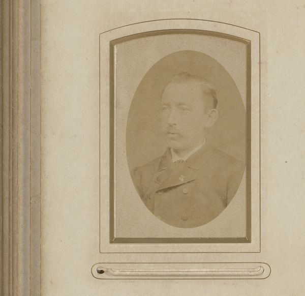 Curator: Ah, yes, this gelatin-silver print from between 1850 and 1900. It's titled, "Portret van een staande man met snor," or "Portrait of a standing man with a mustache" and is attributed to J. Dumas. Editor: My first thought is one of reserved confidence. There’s something in his stance, the way he leans so casually on that prop… He looks like he knows something you don’t, and he’s not telling. Curator: That confident reserve is so typical of the era! Photography was becoming increasingly accessible, solidifying the desire to capture and convey a specific, often idealized, image of oneself. The mustache, of course, would have been a powerful symbol of masculinity. Editor: It’s an amazing bit of facial architecture, really. But look at how faded the image is – it gives him a sort of ghostly, romantic air. Curator: The use of photography allows us to see not only the details of his face and clothing but to understand better his social standing and the importance of the Victorian ideals regarding class and industry. His neutral expression reinforces a very calculated presentation of self. Editor: It makes me wonder about the story behind it. What was his life like? Was he really that stoic, or was it just the fashion of the time to appear so? It's that contrast between what's presented and what's concealed that's compelling. Curator: Perhaps what fascinates me most is the cultural weight these images continue to carry. As we look back, we’re confronted with reflections on who we were and the symbolic language we used to understand the world. Editor: Yes, like whispers from a past era…It also shows how much and yet how little things change, from the curated performance we call the self to our ways of constructing meaning from visuals. Food for thought!