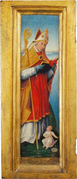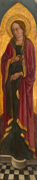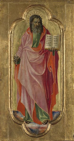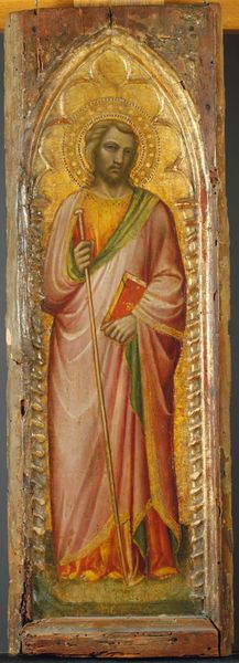 Curator: Standing before us is Spinello Aretino’s “Saint Philip,” tempera on wood, dating from 1384 to 1385. Editor: It possesses an unexpected tenderness. The soft palette and the saint’s downcast gaze create an intimate devotional space, almost separate from the rigid frame and gilded background. Curator: Yes, observe how Aretino employs the pointed arch and elaborate gold leaf details – stylistic hallmarks of the late medieval period. However, his composition introduces nascent Renaissance elements. Note the modeling of Philip's face, a departure from purely stylized representation. Editor: The book in Philip's hands—the Gospel, I presume—anchors him in his symbolic role, while that subtly off-center halo speaks to divine imperfection. Gold, the metal of divinity, frames his sanctity. Curator: Indeed. The limited colour palette--mostly reds and golds with restrained green—highlights the work’s inherent geometry. See how vertical lines emphasize the figure's stature, countered by the gentle curve of his shoulders. Aretino consciously guides the eye. Editor: And that inscription—S. Philippus S.— further contextualizes the image for a contemporary audience. This artwork serves as a devotional icon. Imagine how worshippers then might’ve perceived Philip as both an archetype and relatable figure. Curator: His quiet solemnity perhaps reflects the anxieties and spiritual focus of the period— a counterpoint to the upheavals of the late Middle Ages. His verticality and slender pose suggest he’s above temporal troubles, while still present within it. Editor: Ultimately, it reveals that religious icons aren't simply didactic symbols but carriers of powerful psychological resonance over centuries. Aretino successfully captures this idea. Curator: Precisely, “Saint Philip” epitomizes a liminal moment in art history where linear geometric representation and devotional portraiture exist in visual dialogue. Editor: A captivating exploration bridging materiality and spiritual import!