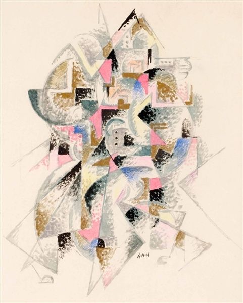 Curator: Alright, let's discuss this captivating watercolor on paper piece entitled "Bermuda, Houses Seen Through Trees" by Charles Demuth, dating back to 1918. Editor: My first impression is one of delicate stillness, a kind of meditative haze. It’s both grounded and dreamlike at once. The geometric shapes and fragmented views of the houses bring a sense of familiarity and mystery to mind. Curator: Interesting! Speaking of geometry, Demuth's adoption of cubist principles is clear here. He's distilled the scene to its essential forms: cubes, rectangles and triangles construct buildings, while nature melts in with curved wisps. Editor: Precisely, the architectural forms are deconstructed and reorganized and feel flattened, reflecting Analytical Cubism, yet softened by the choice of watercolor, which provides an atmospheric softness. It's almost like looking at memory itself – fragmented, evocative, and tinted with emotion. Curator: Indeed. It's remarkable how Demuth manages to evoke the balmy, somewhat indolent air of Bermuda through such rigorous geometric vocabulary. Color here plays such a pivotal role! Editor: It certainly does. Look how the soft, diluted oranges and greys build a tonal harmony with nature: foliage and building become the echo of the same underlying forms. Curator: And observe how the limited color palette further emphasizes form over representational accuracy, shifting our focus toward underlying structures and shapes, which invite you into the hidden aspects and visual structure of everyday architecture! Editor: Absolutely, and perhaps more intriguingly, inviting one to consider architecture and landscape from the interior. A very interior experience, as an artist may experience their own artistic process. Curator: That's a wonderful way to put it. Ultimately, this piece speaks volumes about the subjective gaze and its power to reshape reality. It makes you realize the world is essentially made of simple shapes that exist as emotional impressions as well as tangible objects. Editor: A great artwork often transforms how you look and perceive things. This conversation transformed the way I viewed the composition from the first glance. Thank you.