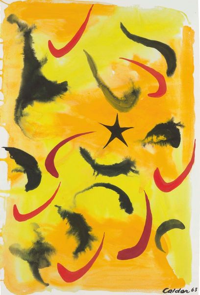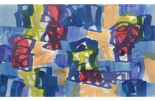 Editor: Here we have M. Lupow’s *Exercise in free color use*, a vibrant watercolor piece. The layers of color really stand out. What do you see in this piece, in terms of the materiality of its construction? Curator: The raw materials of paper, pigment, and water are the immediate focus. How the artist manipulated these substances is key. The 'exercise' seems to be about exploring the possibilities inherent in the materials themselves and in the act of applying paint. Editor: So, the process is the subject? Curator: Precisely! It challenges the traditional notion of a subject. The labor is visible, isn't it? The drips, the layered washes... Editor: It is! It makes you think about the artist's hand and the flow of the paint. Curator: Right. And the relatively small size further emphasizes the intimate, almost private nature of this material exploration. Editor: I see how thinking about the making informs the work! Thanks.