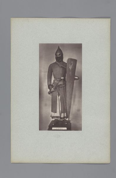 Curator: The work before us is a photographic print dating back to before 1882, currently residing here at the Rijksmuseum. Its rather lengthy title tells us it's a "15th-century armor with sword and bow from the army of Charles VII of France, from the collection of the Musée d'Artillerie in Paris." Editor: Immediately, I'm struck by its melancholic stillness. There's an almost ghostly presence to this lone suit of armor, removed from its context, a solitary figure caught in time. It’s as if the weight of history, the countless battles and sociopolitical conflicts this armor witnessed, has been compressed into this image. Curator: Indeed, and that's partly due to how photographs gained popularity during that era, intertwining art and documentation in representing national narratives and ideals. This photograph reflects the French interest in solidifying and remembering their historical heroes. This representation, and similar displays, shape our understanding of power and identity tied to Charles VII. Editor: I wonder about the intended audience, and what it means to put this historical figure’s representation on display. Doesn’t that reify these notions of power through what theorists like Foucault described as “docile bodies"? By visually re-presenting this armor, it can promote nationalist sentiments through a visual lens, connecting viewers to certain ideals of medieval Europe and war, even promoting or reinforcing such behaviors as strong, patriotic or brave. Curator: You make a compelling point about docile bodies. The photograph aestheticizes the implements of war, which in turn gives a nostalgic patina to the harsh realities. It evokes romanticized notions, such as the nobility and even chivalry associated with medieval warfare. But for soldiers it’s not chivalry; it’s about national interests or, as you suggest, certain political inclinations, and sometimes about maintaining power and suppressing social dissent. Editor: Absolutely, it glosses over the bloodshed and systemic oppression that these wars perpetuated. When art isolates, elevates, and romanticizes objects linked to conflict, it subtly sanitizes historical injustices and becomes part of the cycle. To fully grasp this photograph, we need to dismantle these mythologies by questioning not just what the armor represents, but whose perspectives are privileged and suppressed by this artistic approach. Curator: Precisely. It urges us to acknowledge the biases embedded within the art historical cannon and confront art’s potential as a tool of propaganda, and an endorsement of hegemonic powers. Editor: I think that unpacking historical and social connotations through this critical lens provides insights not just into our past but offers essential context in confronting the complex structures in contemporary power dynamics.