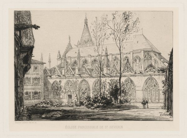 Curator: We're looking at Donald Shaw MacLaughlan's etching from 1900, "Notre Dame, Paris," currently held at The Art Institute of Chicago. Editor: It's incredibly detailed, but also feels light, almost ethereal. The stark white foreground really emphasizes the density of the etched lines in the cathedral itself. I’m struck by how this one building looms so dramatically over the thin strip of the lower scene. Curator: Yes, MacLaughlan really captures the imposing presence of Notre Dame, a building saturated with centuries of spiritual and civic symbolism. Think about what this structure represented to Parisians in 1900 – a monument to faith, a marker of resilience, even national identity. The way he uses line variation pulls out the iconic rose window like a beacon. Editor: And that density of line also tells a story about labor, doesn’t it? Etching is a time-intensive process. It’s interesting to consider MacLaughlan’s own labor mirroring the generations of skilled laborers who built the cathedral itself – different scales, of course, but a connection to the hand-made, to tangible effort and skill. The way etching so economically uses the expensive paper to generate shadow suggests both a cost-saving ethos as well as highlighting the linear detail in relation to space. Curator: Absolutely. Plus, Notre Dame isn't just stone; it's an anthology of symbolism. The towers, reaching heavenward, are testaments to man’s aspirations. Then you consider how often we’ve seen this cathedral serve as a symbol, think Victor Hugo to present-day images after the fire. These images become shorthand for French culture itself. Editor: Thinking about it being an etching, produced for reproduction and distribution, brings up another layer. It makes me consider the artwork's intended audience and the role it played in shaping a view of the cathedral as something that can also be commodified as something artistic in itself. It asks how architectural heritage turns into an artwork with commercial circulation in ways unavailable to laborers working on the structure over generations. Curator: Indeed. Seeing it, understanding it – and possessing its image become intertwined. Thank you for your thoughts about the social and material context of this etching, its creation, labor, and consumption. Editor: It was a pleasure looking closer together. The emotional, social, and cultural complexities of this etching come through even more strongly considering your points.