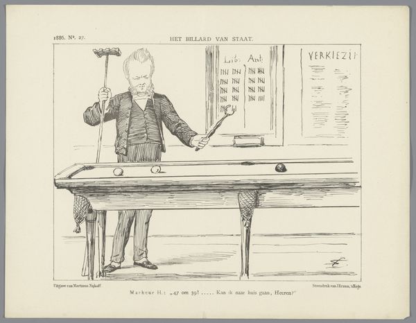 Johan Michaël Schmidt Crans created this print in 1863 using what looks like lithography, a medium that perfectly captures the detailed lines and tonal variations crucial to caricature. The composition is sparse yet evocative, dominated by a well-dressed man centrally placed amidst an array of vacant benches and chairs. Each seat is labeled with the name of a bank, implying a glut in the financial sector. The perspective cleverly foreshortens the scene, making the benches appear to stretch into an almost infinite distance, thus exaggerating the proliferation of banks. The artist uses the semiotic language of public furniture to symbolize stability and accessibility, but the emptiness suggests the opposite—perhaps overextension or instability. The figure in the background adds a layer of dynamism, as he is about to smash a bench. Crans plays with the idea of representation itself; benches stand in for banks, raising questions about the solidity of financial institutions and the very structures that underpin economic confidence. This is not just a cartoon but a commentary, using formal devices to destabilize the viewer's understanding of the financial world.