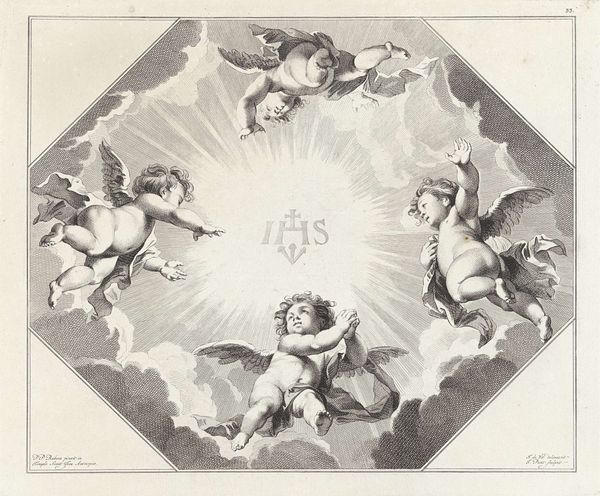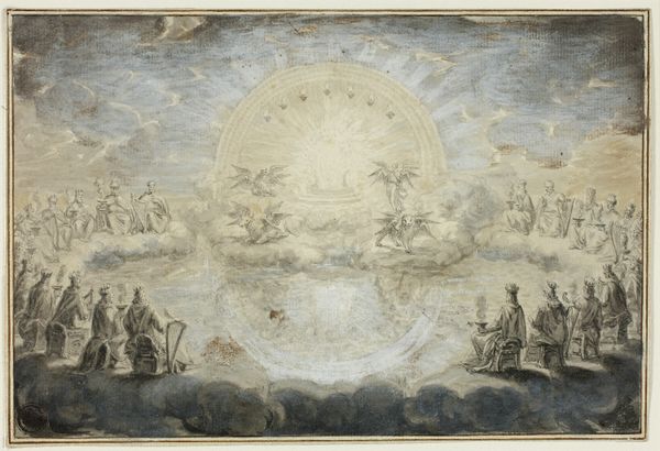 Editor: This drawing, "Putten verehren das heilige Sakrament," meaning Putti Adoring the Holy Sacrament, is attributed to Gaspare Diziani. It seems to be executed in graphite, ink, and chalk. I find it interesting how the figures create such a lively dynamic within the oval composition. What formal qualities strike you when you examine this work? Curator: The emphasis is undeniably on the interplay of form and space. Consider the composition: an oval field populated by clusters of putti and billowing clouds. Note how the radiating lines emanating from the monstrance both anchor and energize the visual field. This division between dark and light provides further depth within the work. Editor: Yes, there’s a clear structure at play. Are there specific elements of the composition that seem most important in establishing its structure? Curator: Observe how Diziani employs a limited tonal range. This contributes to the unity of the composition. The clustered putti act as framing devices, leading the eye toward the symbolic core – the Holy Sacrament. Do you notice any structural parallels between the arrangement of the clouds and the placement of the figures? Editor: Now that you mention it, yes! Both elements are distributed unevenly. The clusters add movement but maintain balance by how they correspond with each other around the perimeter of the oval. What does this interplay suggest? Curator: That tension invites closer scrutiny. The spiraling effect emphasizes not only the allegorical reverence of the subject but also the inherent dynamism within the artwork itself. It presents a baroque fascination with visual complexity contained within an ordered framework. Editor: Fascinating. Focusing on the forms and composition really brings out how much is going on beneath this seemingly simple drawing. Curator: Indeed. It exemplifies how structural analysis can enrich our appreciation, guiding us towards the essence of the artistic endeavor.