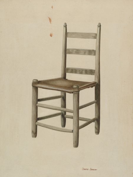 Editor: This is Ferdinand Cartier's "Side Chair," a watercolor and drawing from 1937. It's so straightforward, almost austere, but the blue patterned cushion hints at something more luxurious. How would you interpret its function and place in art history? Curator: Considering its context, this "Side Chair" appears as an intriguing negotiation between mass production and artistic aspiration in furniture design. 1937 places it squarely within a period grappling with the social responsibilities of art. What purpose might a drawing like this serve in the late 1930s? Was it meant to democratize good design? Editor: Well, given the social climate, perhaps this drawing was trying to make good design accessible to ordinary people. The classic lines also feel familiar, and perhaps meant to counter some of the more radical and unsettling designs coming out at that time. Curator: Exactly. It subtly embodies the complex interplay between high art, industrial production, and the socio-political function of design. This chair isn't just an object; it represents aspirations and perhaps anxieties surrounding the role of art in shaping society. What statement does the artist make, by choosing such a ubiquitous object as a chair? Editor: It makes you think about how art is connected to everyday life, and about who gets access to 'good design.' The visual simplicity almost feels like a statement in itself. I hadn't considered its social and political dimensions at first. Curator: Precisely. Sometimes, the most ordinary objects tell the most compelling stories about our culture and values. Looking at it this way has shifted my understanding of its importance.