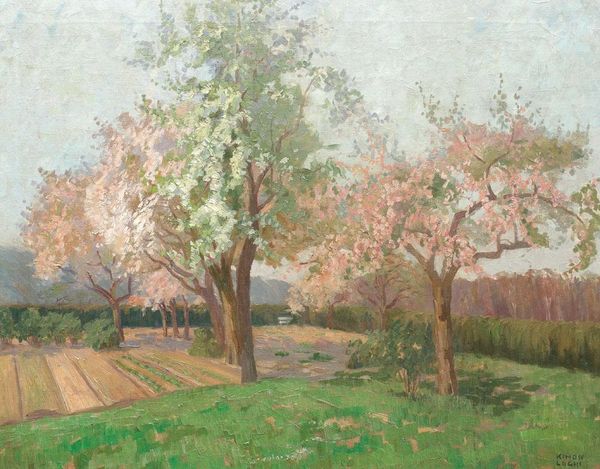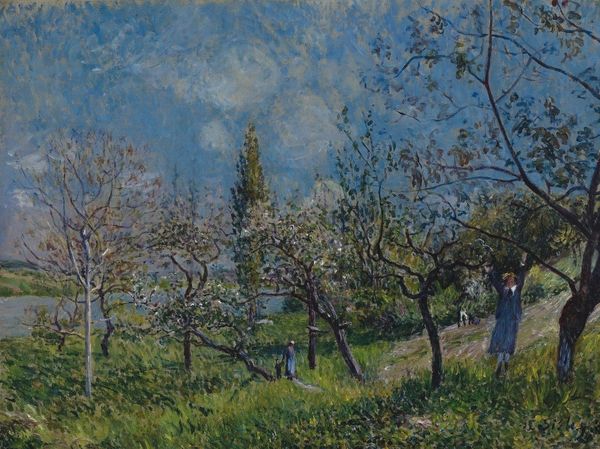 Curator: This painting is titled "Brides walk under the apple trees." It’s a captivating example of Henri Martin's plein-air style, likely painted sometime in the late 19th or early 20th century. Editor: Immediately, I feel a sense of serene optimism, a romantic stroll into the future. The pastel hues are gentle, yet there's an energy from the broken brushstrokes. Curator: Absolutely. Martin's adoption of Impressionist techniques gives the whole scene a feeling of lightness and spontaneity, despite its lack of precise details. How does it make you feel? Editor: Considering the title, there's an interesting juxtaposition. These two figures are indeed central, yet they almost blend in, enveloped by nature. I wonder about the societal pressures, or perhaps lack thereof, for these women, and the agency afforded to them. Are they brides seeking shelter or asserting their independence? Curator: It's tempting to think that they are sheltered, literally under the trees. Historically, Martin exhibited extensively in the state-sponsored Salons. We have to wonder what he intended by that, when creating art for public display in those political and social contexts. Editor: Yes, there's definitely a formal element to consider with this subject. It would be fascinating to consider its original exhibit location and explore how audiences would have considered a seemingly benign work during such a transformational period. Curator: I find it so evocative in the way it seems to depict both timeless love and also very specific socio-historical moments that affect gender, class and love relations in those periods. Editor: And the light itself seems almost celebratory, illuminating the delicate blossoms. I find myself asking what contemporary celebrations might similarly reflect on, what elements of both joy and the political. Curator: Ultimately, it shows that landscape painting can be deeply involved in public questions of history and social place, Editor: Leaving us to think about those histories with fresh eyes.