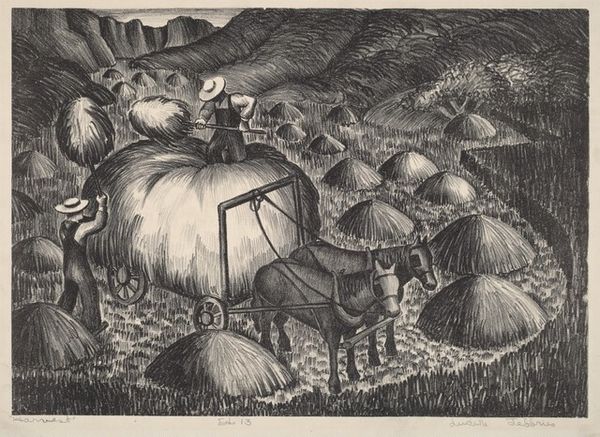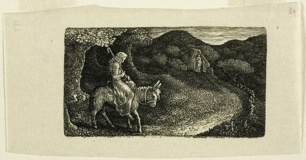 Curator: Edward Calvert's "The Return Home" presents us with a pastoral scene in miniature, its dimensions a mere 41 by 76 millimeters. Editor: It's incredibly evocative. The high contrast gives it a dreamlike, almost allegorical quality. Curator: Indeed. Note the intricate, almost obsessive mark-making. The figure on the donkey, the dwelling, the landscape itself—all are meticulously rendered. The composition leads the eye inward. Editor: It's interesting to consider this return in the context of early 19th-century England, a time of immense social upheaval and the rise of industrialization. Is this idealized rural life a response to those changes, a yearning for something lost? Curator: Possibly. The formal construction suggests a symbolic intent beyond the purely representational. The density of the marks creates a rich, textured surface which adds to the overall feeling of harmony. Editor: I find myself wondering about the female figure in the doorway. Is she a welcoming presence, or a symbol of something more complex? Perhaps the promise, or the illusion, of domestic tranquility? Curator: A valid point. Ultimately, "The Return Home" invites us to contemplate the interplay between form, content, and historical context. Editor: It seems to be an intimate reflection on longing, belonging, and the search for sanctuary in a changing world.