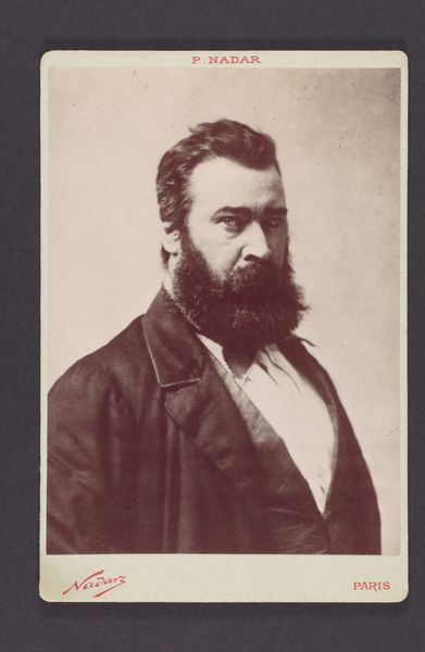 Editor: So, this is Nadar's portrait of Jean-François Millet, a gelatin silver print from somewhere between 1856 and 1858. There's a real sense of presence and seriousness here, something very grounded in reality. How do you interpret this work, particularly given Millet's position as a Realist painter? Curator: It's important to consider the social and political currents flowing through 19th-century France. Realism wasn't just an aesthetic choice; it was a statement. Think about Millet’s paintings, often depicting rural laborers. Nadar, in photographing Millet, does more than capture a likeness; he captures the ethos of a movement invested in representing those often ignored by the dominant narratives of the time. Editor: So the choice of Millet as a subject itself becomes a political act? Curator: Precisely! Nadar’s studio was a gathering place for intellectuals, artists, and political activists. This portrait elevates Millet, linking him to a broader dialogue challenging academic art and championing the lives of ordinary people. Think about photography's accessibility, in contrast to painting, which was traditionally tied to wealth and patronage. Who had access to having their image produced and distributed? Editor: I hadn’t considered that angle of accessibility. It frames the portrait as a conscious effort to democratize representation. Curator: It absolutely does. How does Nadar use lighting and composition to shape our perception of Millet? It's not romanticized; it's a direct, unvarnished portrayal of a working artist. This work subtly questions who we value and how we represent them within society. Editor: Looking at it again, I see how the realism is front and center here. It goes beyond just mimicking life; it is championing a certain segment of society through art. Curator: Indeed. It is a subtle yet profound commentary on power, representation, and the value of everyday life, still relevant today.
