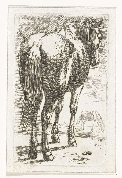 Curator: At first glance, this little etching just looks like a humble beast of burden trudging along. I'm curious to see what its story might be... Editor: "Feeding Mule - Rear," created around 1800 by Johann Christian Reinhart. It’s currently held in the collection of the Art Institute of Chicago. Look closer; beyond the animal, there are sweeping sociopolitical undertones. Curator: Reinhart's signature "Rome 1800" really sets the stage, doesn't it? It feels so… old. This poor thing, seen from the rear, is loaded down with what appears to be travel gear or wares in the basket. He looks completely burdened and yet... there is almost a rustic kind of beauty to the etching. Editor: It speaks volumes about labor, class, and even empire, doesn't it? The landscape—almost a romantic backdrop—ironically throws the animal's weary posture into sharp relief. One can’t help but question: who profits from the beast’s labor, and what systems perpetuate that arrangement? Curator: Right, exactly. The composition guides our eye right up its hindquarters! Talk about subjugation. But did the artist choose the perspective to express some deeper sympathy for working animals, perhaps, in that Neoclassical age of grand human narratives? Editor: Possibly, though it is necessary to interrogate whose perspectives history amplifies and whose labor it exploits. History paintings were extremely popular in the late eighteenth century, reflecting revolutionary interests; however, one can apply that same perspective when considering animal labor within that era, understanding how animals may also be pawns or causalities of revolution and historical progression. Curator: I guess what I find interesting is this intersection of animal and setting: Reinhart positions the mule and that simple cart against a complex, historic vista. It begs for a more contemporary consideration beyond labor economics to ponder on our relation to nature itself, no? Editor: Absolutely! These representations aren’t merely aesthetic—they actively shape our understanding. They provide insight into our societal structures, then and now, urging a more critical engagement with the treatment of laborers, the impact of capitalist exploitation on animals and landscapes, as well as whose voices dominate visual discourses. Curator: You are right. The quiet endurance of this unassuming beast reverberates into louder, far more complex and meaningful dialogues. Thank you! Editor: And thank you! It's a crucial reminder of how deeply history shapes our present, as well as what stories and realities sometimes go unheard, or unseen, within common settings.