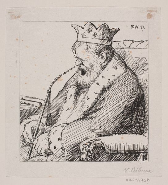 Curator: This ink drawing, simply titled "Bearded Man with Cap", was rendered by Carl Ludwig Stieglitz sometime between 1737 and 1787. What strikes you initially about this image? Editor: It feels...unfinished, almost like a fleeting thought captured on paper. The bold, almost frantic lines give it a sense of urgency. But that headdress dominates the composition and my reading of the subject. Curator: Stieglitz, while working firmly within art historical traditions, wasn't merely replicating styles. The inscription, "D'après le Dessin de Rembrand", acknowledges a lineage, while marking its own intervention within visual culture and reception. What do you make of its self-declared source text and intention? Editor: Right, so, this acknowledges Rembrandt as a reference. It could be about Stieglitz grappling with notions of artistic inheritance and its authority—who gets to represent who and how. Is the reproduction about extending, or commenting on it? Where is Stieglitz inserting himself? The man himself doesn't seem ennobled, it isn't a grand depiction. I think he might almost be mocking our need to make authoritative statements. Curator: I find that observation compelling. The looseness of the linework pushes back against a purely academic reading. The drawing possesses a raw, almost rebellious energy that sits at odds with some 18th-century portraiture and drawing. If the source is Rembrandt, what elements are consciously carried across, or abandoned, and how do you feel this tells the audience about cultural shifts that impacted this artwork in specific ways? Editor: Perhaps that raw quality speaks to an emerging artistic identity at the time, one starting to question conventions? This image almost invites you to question the man’s internal world but refuses you that access; to deny easy answers and demand we look harder. Curator: Exactly, a resistance towards passive consumption and instead fostering engagement with ideas about lineage, labor, artistic responsibility, and identity within the art historical canon. Thank you, I think our visitors will appreciate that perspective. Editor: Thanks. I, for one, want to revisit this drawing now, with this awareness.