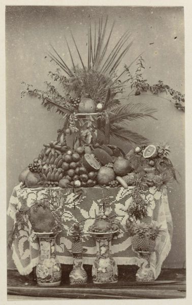 Roger Fenton's photographic still life captures a generous arrangement of fruit in a subdued palette of greys and browns. The composition centres around a lavish display of grapes, a pineapple, and various other fruits, all meticulously arranged on what appears to be a draped table. The image exudes a tactile quality, drawing attention to the textures of the fruit and the fabric beneath. In considering the context of Fenton's time, the photograph operates as a signifier of Victorian ideals and aesthetics. Fenton manipulates light and shadow to imbue the scene with a certain formality and controlled artifice. The selection and arrangement of objects are carefully considered, reflecting a preoccupation with domesticity and the abundance of nature. The photograph’s formal qualities, particularly its tonal range and balance, go beyond mere documentation. It speaks to a deeper cultural narrative about nature, abundance, and representation. The act of photographing fruit transcends its material reality, transforming it into a symbol of both artistic expression and cultural values.