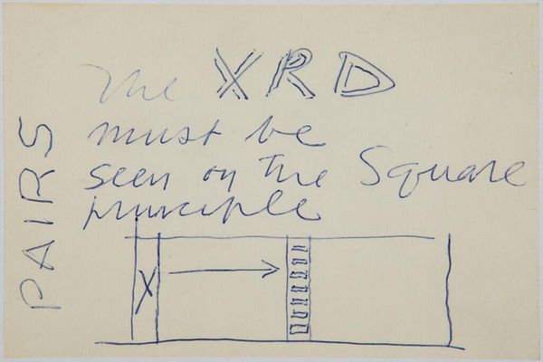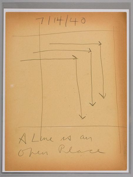 Curator: Here we have "Art Theory Text with Maximum Ratio Differential Diagrams," a small sketch by Stuart Davis. Editor: It feels like a coded message—almost playful, yet somehow deeply serious in its own language. Curator: Exactly. Davis is diagramming art theory, the very nuts and bolts of his compositional method using rudimentary shapes and text. The "Line-Position Method," as he puts it. Editor: What strikes me is the arrow pointing up from the words "This drawing is a plan for a Drawing." It feels like a symbolic arrow, almost directing us towards transcendence. Curator: It’s a schematic drawing to reveal the hidden structure underpinning the artwork. Editor: Davis invites us to witness the genesis of the art. I find that profound. Curator: A rare look behind the curtain of creative thought. Editor: It's an unexpected, but welcome, glimpse of the artist at work.