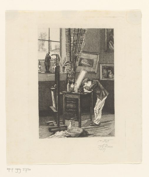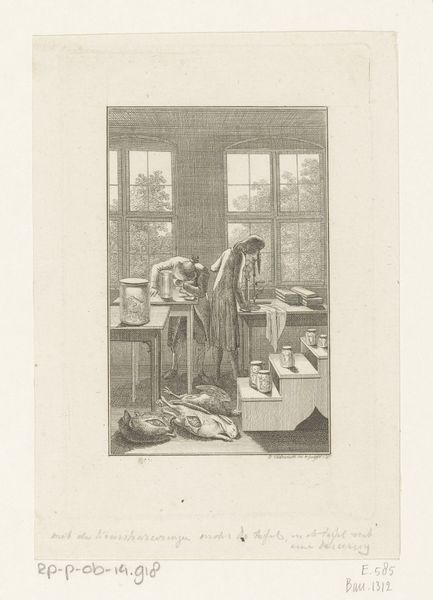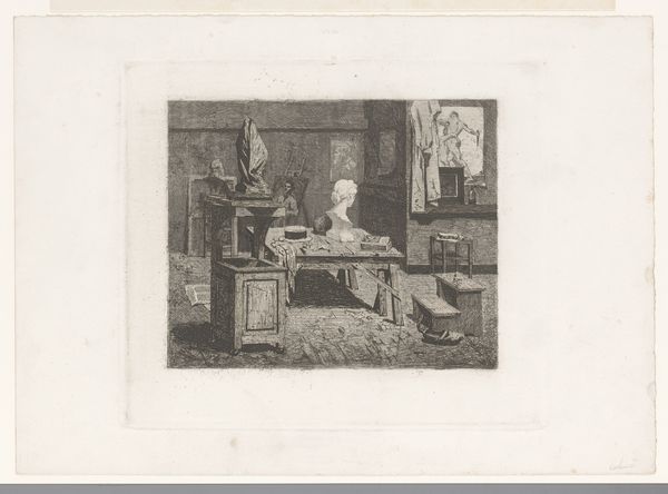 Editor: This is "Atelier van een prentmaker," or "Printmaker's Workshop," created around 1748 by an anonymous artist. It's an engraving, and the detail is amazing! I'm struck by how it meticulously captures all the tools and processes of printmaking. How would you interpret this piece purely from a formal standpoint? Curator: Indeed, the detail is remarkable. Let us consider the image's structure. Observe how the artist has organized the composition to guide our gaze. The linear perspective, rendered meticulously, creates depth, leading our eyes from the foreground’s array of tools towards the seated printmaker. Editor: So, the perspective isn’t just about showing space, but also about directing our attention? Curator: Precisely. The orthogonals converge near the figure at the desk, subtly emphasizing his role. Note also the use of line. Each stroke contributes to the overall form, defining shapes and textures with incredible precision. Is there an inherent quality suggested by the choice of line itself? Is it sharp or soft? Editor: Sharp, definitely sharp. It makes the image feel very precise and almost clinical, even though it's depicting a workshop. It's interesting how that choice affects the overall feeling. Curator: Yes, consider how that linearity affects your sense of the materiality represented. What sense do you get from the surfaces of those forms due to that specific application of line? Think, as well, about the light. Observe how light and shadow are evoked through the density and direction of the engraved lines, creating volume and texture. Editor: It brings out the texture of the stone sculptures in the background. I wouldn't have thought about light so much in an engraving! Curator: The relationship between light and form is essential to understanding visual composition in any medium. Through close examination, we perceive how the artist manipulates these intrinsic qualities to convey a sense of depth, space, and even atmosphere, regardless of the representational qualities within the image. Editor: I see what you mean. By focusing on the lines, light, and perspective, we can understand how the artist created this detailed and captivating scene, regardless of knowing the historical context of printmaking at that time. Thanks for opening my eyes to it. Curator: The pleasure is all mine.