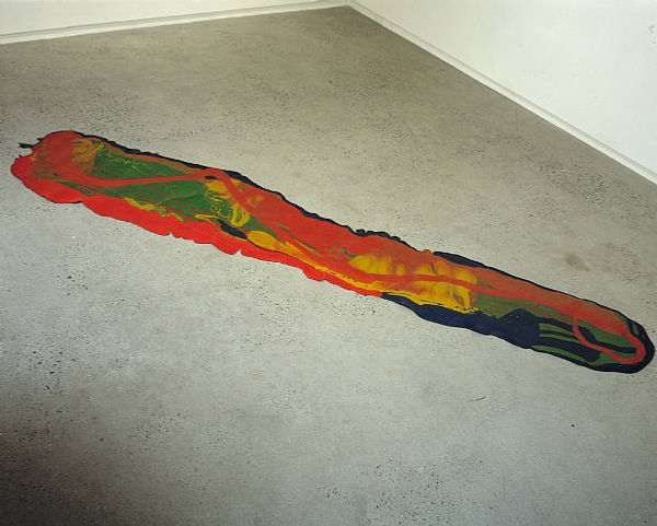 Lynda Benglis made *Contraband* by pouring latex paint directly onto the floor. I love the sheer audacity and the celebration of process here. The colours are so vibrant and playful, all swirled together like a psychedelic river. It’s thick and gloopy, you can almost feel the weight of the latex. I imagine Benglis, letting the paint flow and pool, trusting the materials to do their thing. There’s a part in the middle where the red bleeds into the yellow, creating this intense orange, it’s like a little sun radiating heat. The blue, haphazardly streaking through the other colors is what keeps the piece from being too 'pretty.' Benglis reminds me of Eva Hesse in the way she embraced the unexpected and pushed the boundaries of sculpture. Both artists remind us that art is about exploration, about taking risks, and about letting the materials lead the way.