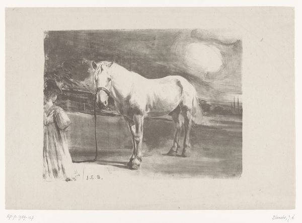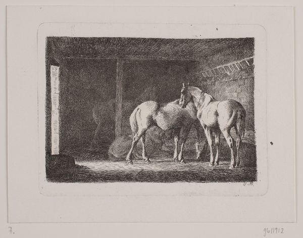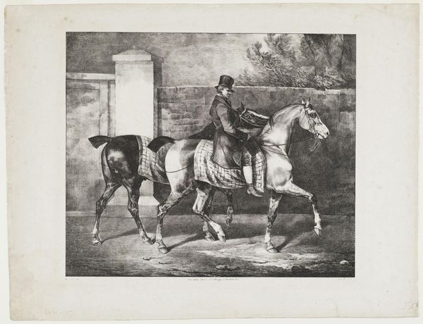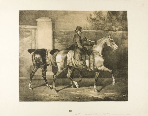 Editor: This is Théodore Géricault's "Old Horse at the Door of a Tavern," a print housed at the Harvard Art Museums. There's a weariness in the horse's posture that really strikes me. What historical context might inform this image? Curator: Géricault was deeply interested in the marginalized, wasn't he? Think about the social implications of representing a tired working animal, especially during the Industrial Revolution. How does this image speak to broader issues of labor and exploitation? Editor: So, the horse becomes a symbol for the working class, perhaps? It makes me wonder about the figures beside it, too. Curator: Exactly. And consider Géricault's own privileged background. Does he critique or simply observe? Exploring this tension, the artist's gaze, is key. Editor: I never thought about it like that. I'll definitely look at Géricault's work in a new light. Curator: Me too. There is always more to unpack when reflecting on the artist's gaze.