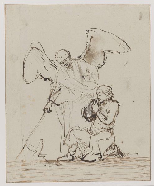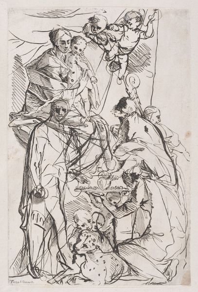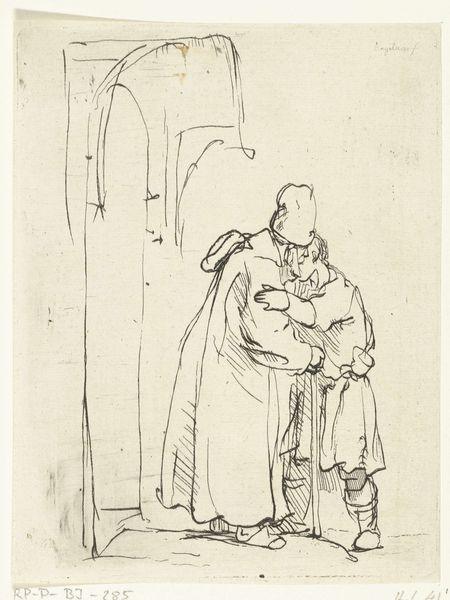 Curator: This is an 18th-century caricature entitled 'Sunday Walk' by an unknown artist from the British School, housed here at the Tate. Editor: Oh, it's hilarious! They look puffed up and terribly important, waddling along. Curator: Caricatures like this were popular social commentary, often poking fun at the wealthy. Their exaggerated features and clothing were designed to ridicule. Editor: I love how sketchy and loose it is. It feels like a quick jab, a fleeting impression captured on paper, you can almost feel the breeze on their faces. Curator: Precisely, the British School excelled at these witty observations of class and manners. It really reflects a society grappling with its own inequalities. Editor: Absolutely. You know, it’s so simple, yet it's so evocative. I find them oddly charming, even in their pomposity. Curator: Indeed, it's a testament to the artist's skill that even without a known name, the work continues to resonate. Editor: A little reminder that we all have our Sunday strolls, our little parades.