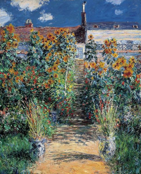 Curator: Take a moment to gaze upon Claude Monet's "The Artist's Garden at Vétheuil," painted in 1880. Oil on canvas, a quintessential example of plein-air Impressionism. What strikes you most immediately? Editor: It feels like a dream you might have of childhood summers. Sun-drenched and intensely nostalgic, despite never having experienced this specific place and time. Those sunflowers rising like golden sentinels… it’s an image both intimate and epic. Curator: The sunflowers are wonderful, aren’t they? Sunflowers often represent adoration, longevity, and unwavering faith, especially during the Victorian era. Given that the path leads up to the house, could this suggest something about home? Editor: Possibly, yes. And perhaps about the cyclical nature of life itself. The child at the bottom of the path, another at the top – are they perhaps the same child, at different stages? A representation of life's journey towards that familial anchor? It has the flavor of something from folklore. Curator: Intriguing interpretation. And consider how the artist uses color and light. See how he captures the shimmering effect of sunlight filtering through the leaves? Notice the impasto technique, creating texture and depth. It invites such curiosity. Editor: Absolutely. Monet's focus here seems to be less on photographic reality, and more about the fleeting impression, the feeling of the space. Those visible brushstrokes themselves feel symbolic – tiny movements making up a much larger whole. Like memories layering upon each other to construct an idealized past. Curator: Monet lived in Vétheuil for three years. This garden clearly served as both a subject and refuge, then. A sanctuary and place for creativity. Editor: A space ripe with life and brimming with feeling. That comes across above all else. And really, it seems an affirmation of the symbolic resonance of the quotidian. Gardens, children, family, light itself. It is where memory, nostalgia, and enduring themes can converge. Curator: Precisely. Each time I revisit it, the garden shifts and deepens. A gift that keeps giving. Editor: A testament to art's unique ability to translate feeling across time and space, leaving the observer feeling the garden blooming somewhere in their own memory.