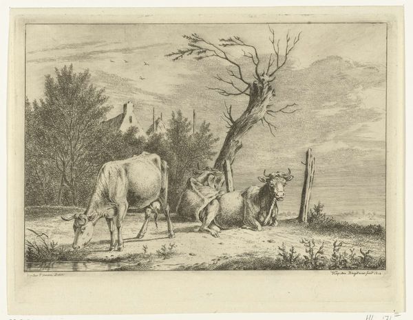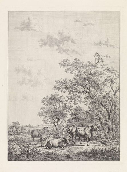 Antonie Franciscus Dona created this etching of a cow in a landscape sometime in the mid-19th century. The image presents a serene view of the Dutch countryside, a popular subject during the Romantic era. In the Netherlands, landscape art served as a form of national expression. It reflected a deep connection to the land and the rural way of life. Artists like Dona often depicted cows, windmills, and waterways, symbolizing the country’s agricultural wealth and its ongoing battle against the sea. This etching, with its careful attention to light and shadow, elevates a simple scene into an emblem of national identity. To fully understand such works, we might examine agricultural policies, land reclamation projects, and the broader cultural values that shaped Dutch society at this time. Only then can we appreciate the complex layers of meaning embedded in this seemingly straightforward image.