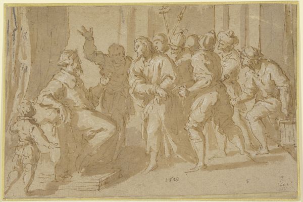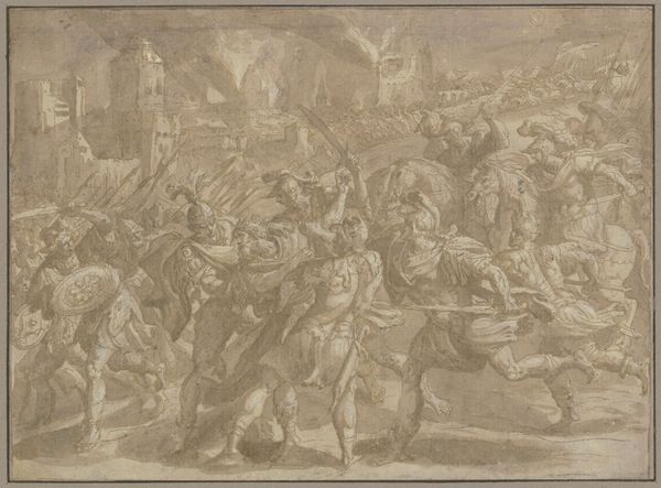 Curator: This drawing, "Christ Falling Under the Cross," is attributed to Caspar Fraisinger and captures a pivotal moment from the Passion. The work on paper uses ink, chalk and charcoal. It’s currently held in the collection of The Art Institute of Chicago. What is your initial reaction to this composition? Editor: Visually, I'm struck by the dynamic yet oppressive atmosphere. The swirling lines, the chaotic layering of figures...it speaks to suffering and brutality, a claustrophobic nightmare rendered in monochrome. Curator: Indeed. Fraisinger employs stark contrasts to emphasize the drama. Notice how Christ, collapsed under the weight, is placed centrally but surrounded by figures rendered in great detail; the lines convey tension, directing our eye across the tableau of Roman soldiers and the gathering crowd. Editor: And that crowd suggests something important, the wider societal and political structures complicit in this moment. Each character, however quickly sketched, represents a viewpoint, from the active oppressors to the silent observers. One cannot separate this drawing from the history of religious persecution. How has its reception evolved over time? Curator: I understand that its power and directness transcends the purely religious, engaging more universally with themes of injustice, struggle, and, ultimately, martyrdom. We observe certain patterns: linear precision is selectively introduced and seemingly abandoned; a controlled technique implies a narrative slipping out of control. Editor: Yes, the lack of rigid perfection in style seems critical here. Consider, the blurring and layering become visual metaphors for the erosion of justice and the blurring of individual moral responsibility within collective violence. Curator: Moreover, the architectural background should be considered within the visual weight this composition manifests. See how it towers behind Christ? Editor: Exactly, that subtle depth that encloses and smothers what little agency Christ and his allies possess in that key moment. By drawing our attention into those finer strokes of perspective Fraisinger exposes his historical era within it too, to the building of religious institutions on violence. Curator: Precisely. His choice of such a raw medium underlines this feeling, the lack of varnish to provide historical transparency here for modern eyes. Thank you for sharing your observations with me. Editor: Likewise. This was a stark reminder of how formal elements can amplify an artwork’s resonance across the ages.
